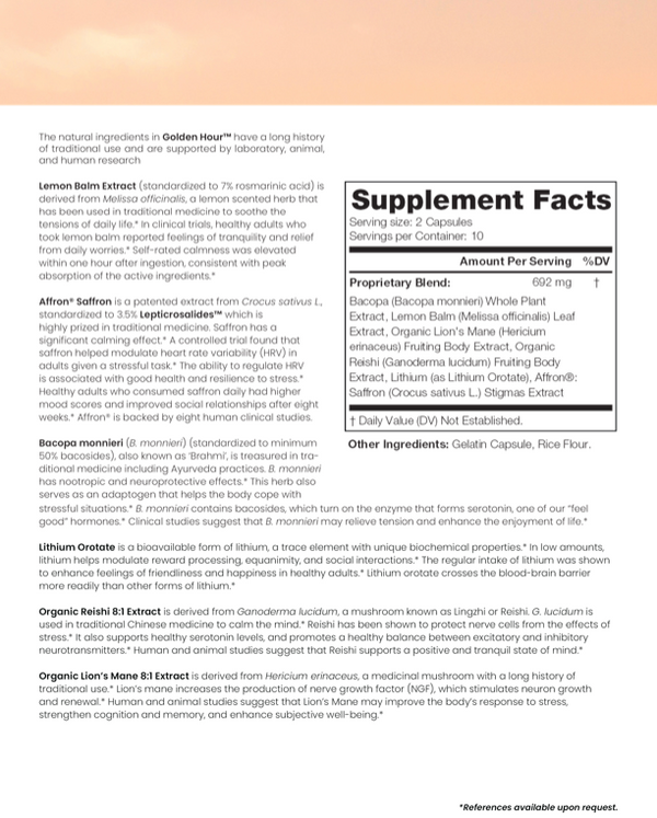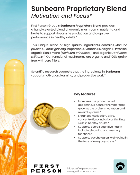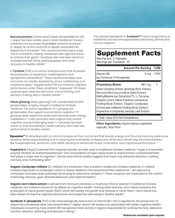 Each supplement in our collection is precisely formulated to support the body's natural production of a major neurotransmitter to deliver desired cognitive effects. Sunbeam targets dopamine, the brain’s motivation and reward system.* Golden Hour targets oxytocin, which mitigates stress and boosts the mind-body connection.* Moonlight targets GABA to prepare the mind and body for deep, restful sleep.*